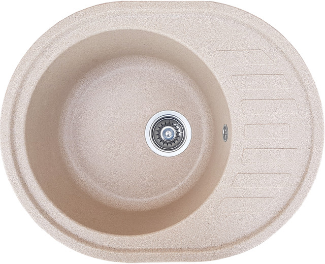 Зручна, компактна модель гранітної мийки з однією круглою чашею розміром 400х195 мм. В якій встановлюється бічній круглий перелив і розміщується основний злив євро-розміру.